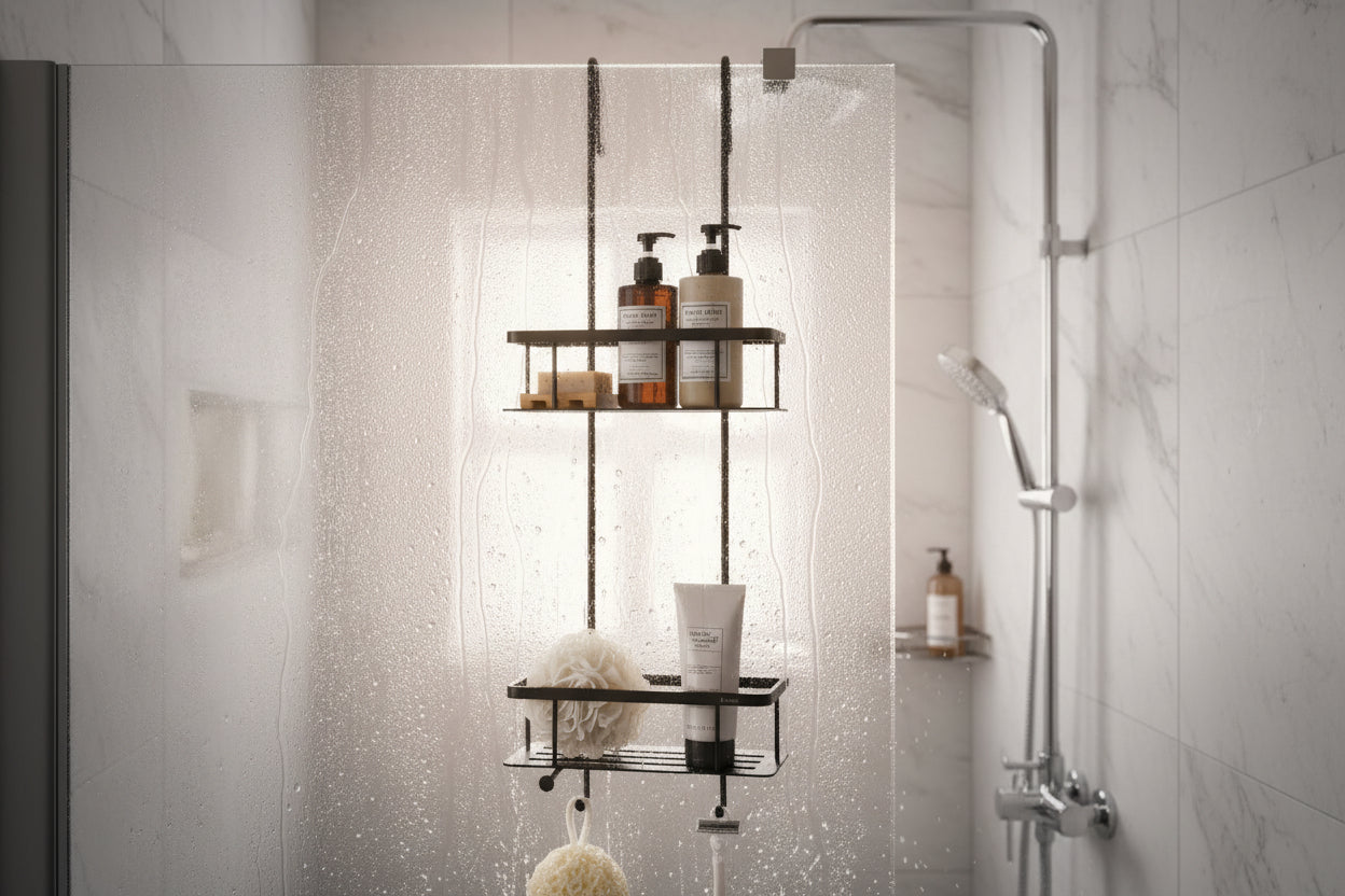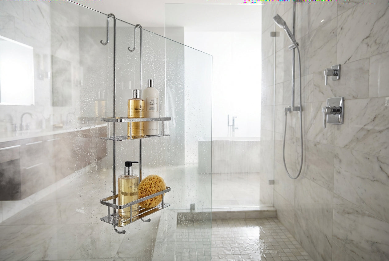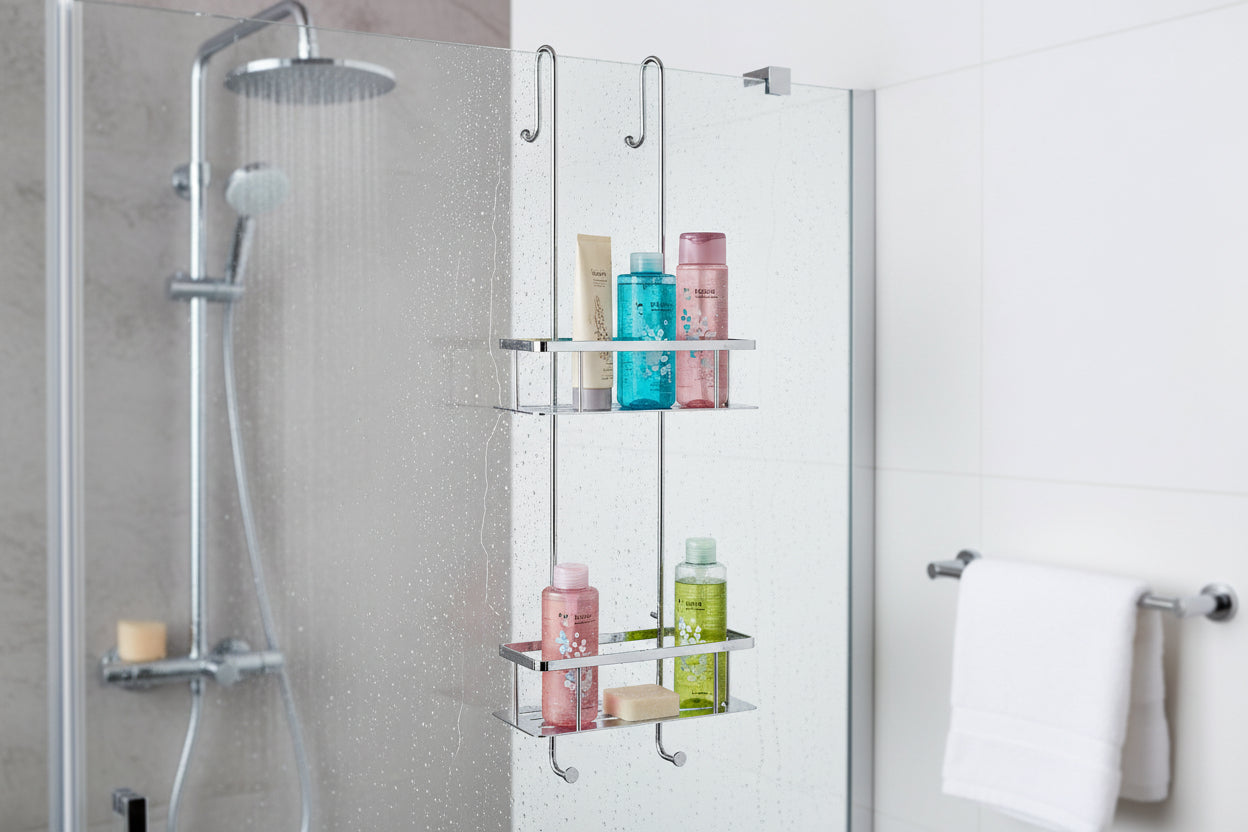 Der Duschkorb lässt sich einfach über die Duschwand hängen und benötigt keine Bohrungen. Dank der beiden stabilen Haken sitzt er sicher und fest. Die Körbe bestehen vollständig aus massivem Messing, die Oberfläche ist hochglanzverchromt – für maximale Beständigkeit gegen Feuchtigkeit und 100 % Rostfreiheit.