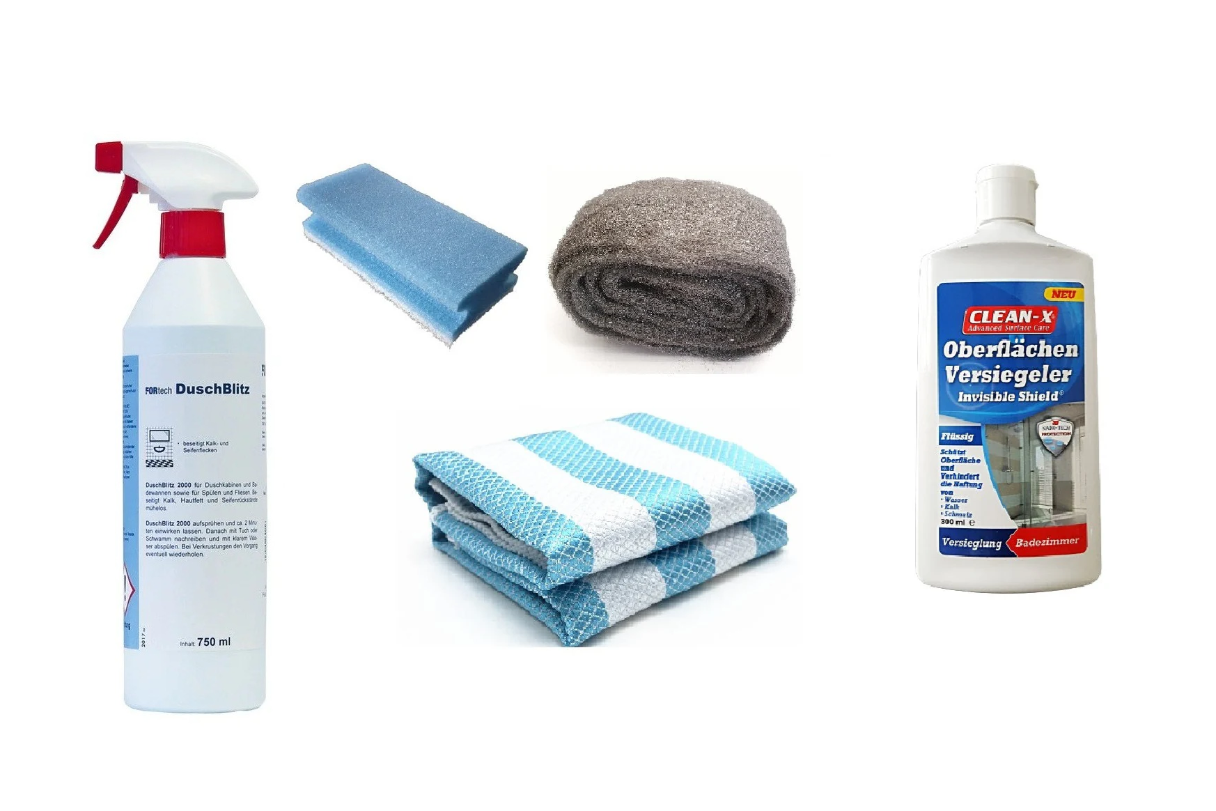Wenn Sie mit normalen Glasreiniger das Glas nicht mehr sauber bekommen, dann können Sie jetzt mit diesem Set wieder für Klarheit sorgen. Das Set hilft Glasduschen zu reinigen, mittelschwere Verschmutzungen zu entfernen, Kalk und Seifenrückstände zu entfernen und das Glas wieder strahlend glänzend zu bekommen. Abgerundet wird dieses Set mit einem Oberflächen-Versiegeler zum Schutz des Glases vor neuem Schmutz.