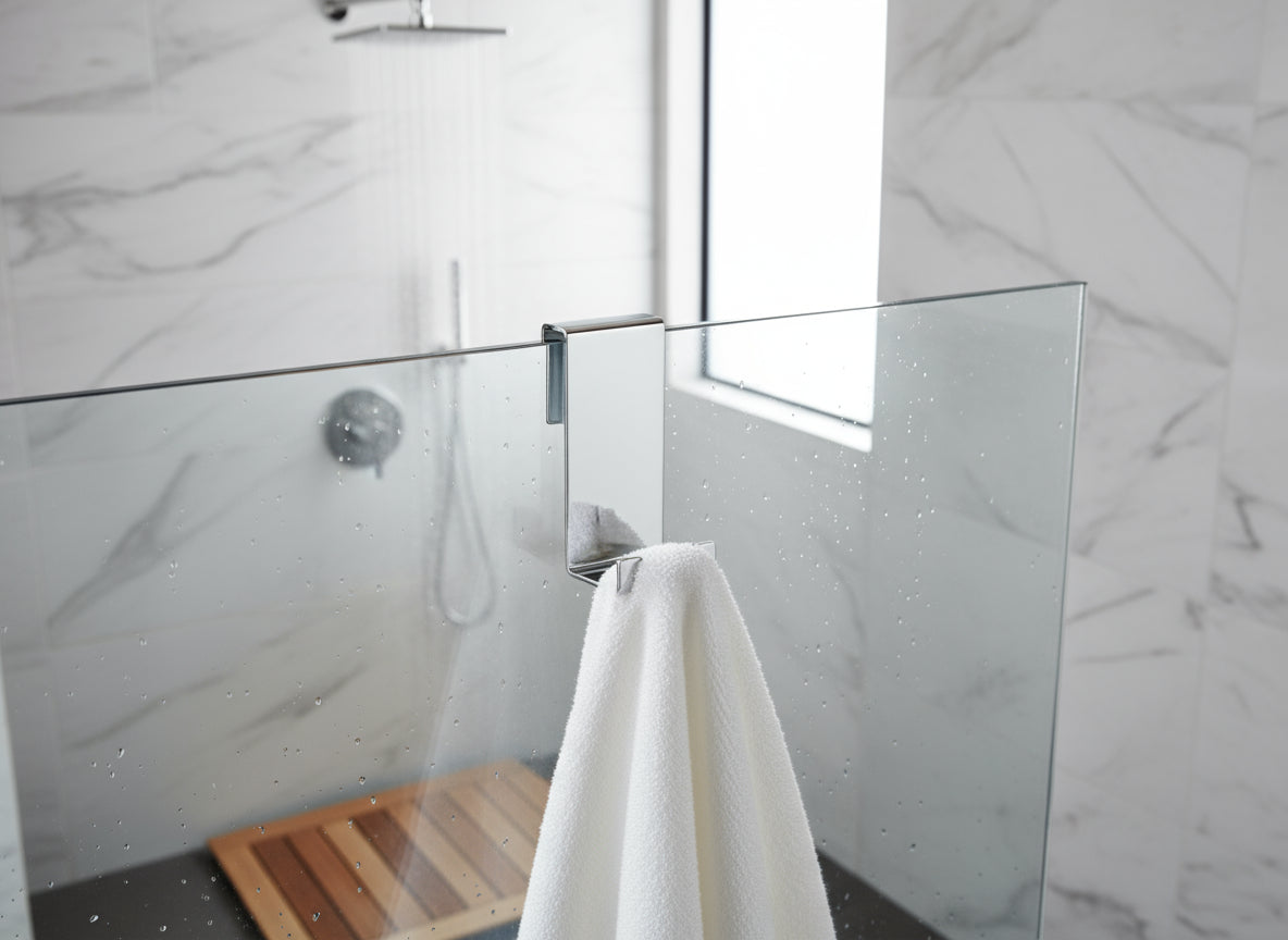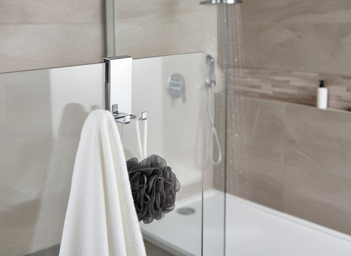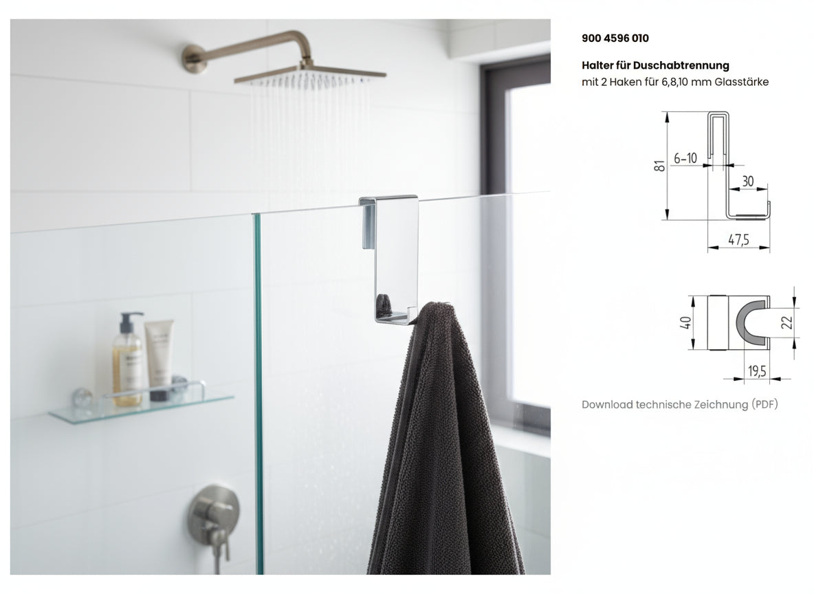 Praktisch, elegant und robust: Dieser Halter für Duschabtrennungen ist die ideale Lösung, um Handtücher oder Bad-Accessoires griffbereit und ordentlich aufzuhängen. Dank der flexiblen Aufnahme ist er für Glasstärken von 6, 8 und 10 mm geeignet – ganz ohne Bohren oder Kleben.