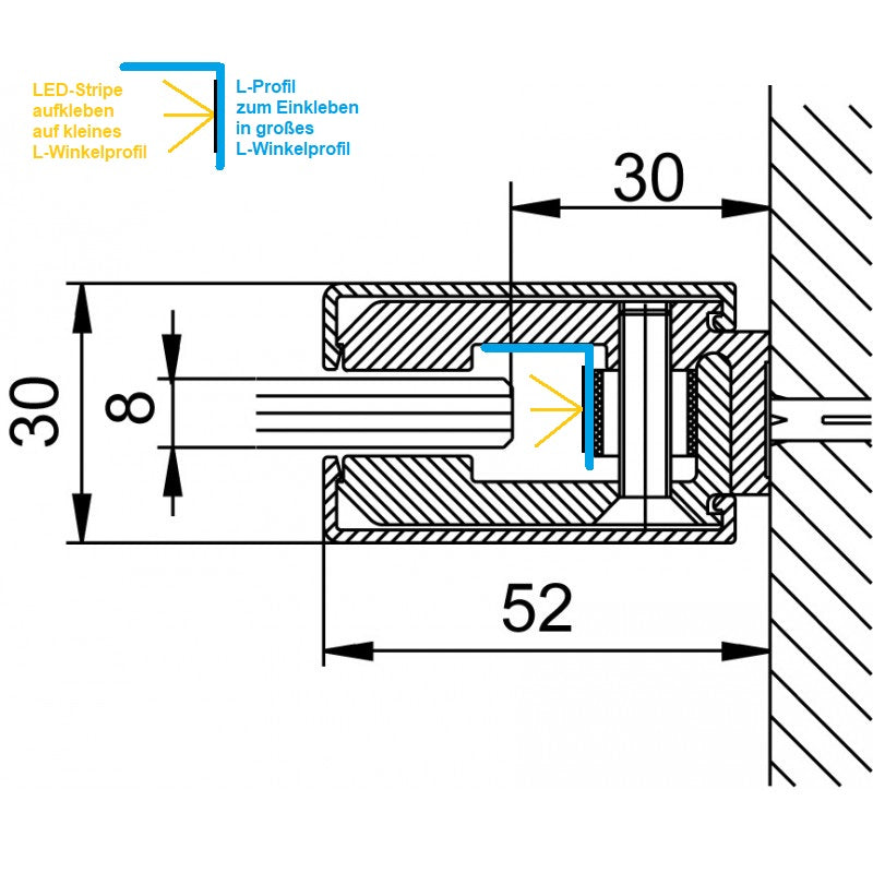 Das L-Winkelprofil ist bauseits in die Vertiefung des GR-Profils mit doppelseitigem Klebeband zu verkleben - siehe Skizze; Auf dem 13x13 mm L-Winkelprofil ist parallel zur Glaskante der LED-Stripe anzubringen.