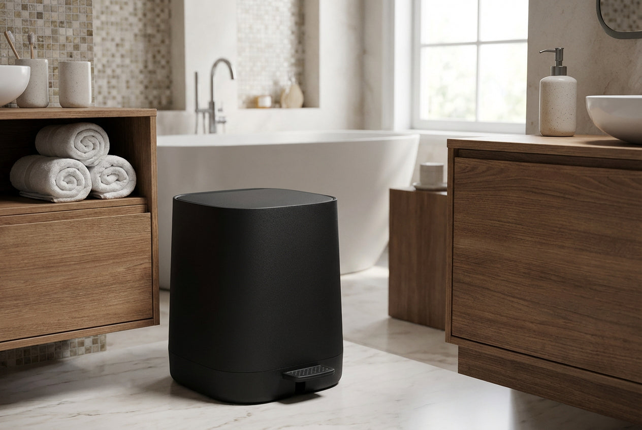 Der Kosmetikeimer aus der markanten Square-Serie besticht durch seine klare, kubistische Formsprache mit sanft abgerundeten Kanten. Als Teil der skandinavischen Designlinie vereint dieser Treteimer ästhetischen Minimalismus mit hohem Bedienkomfort.