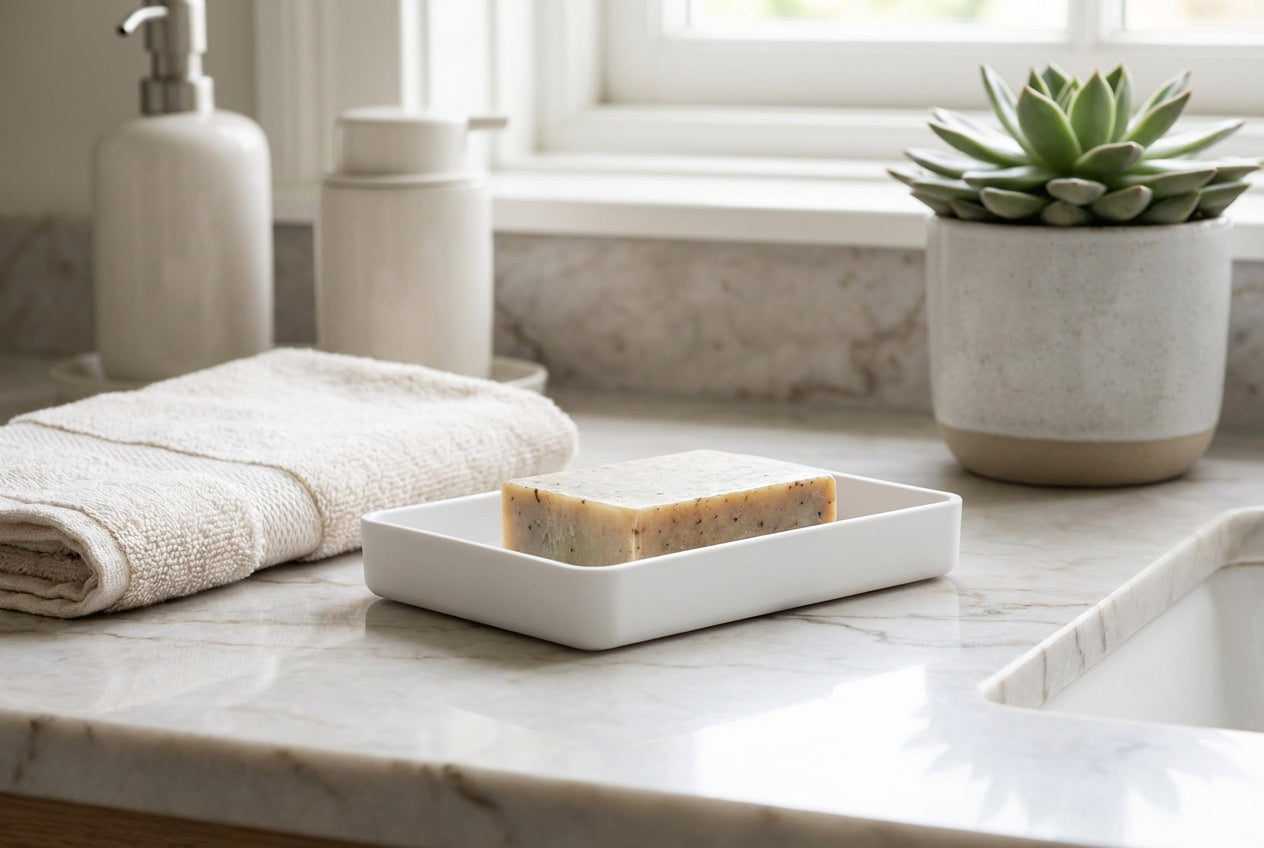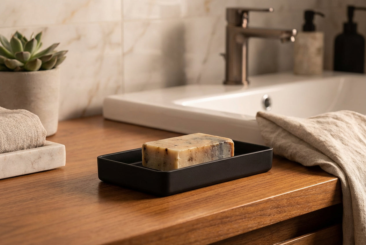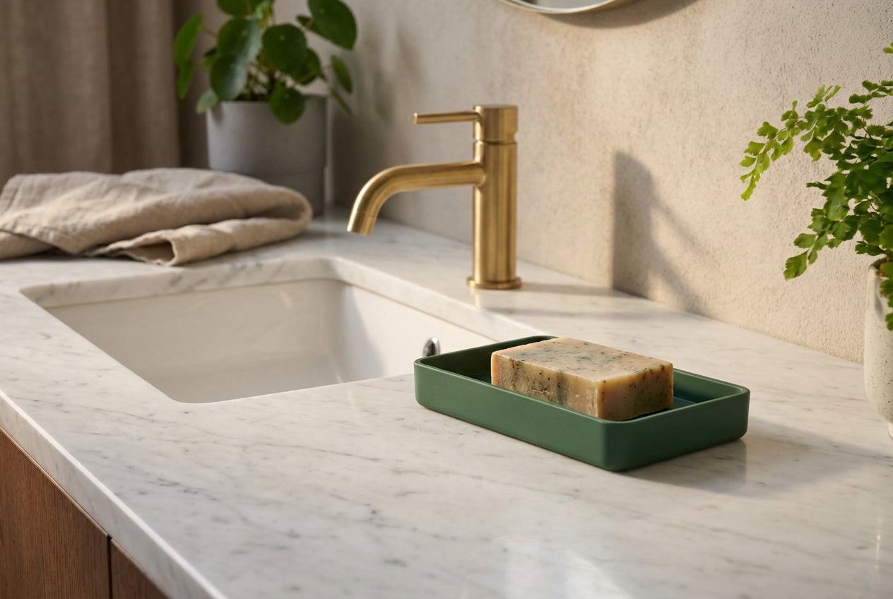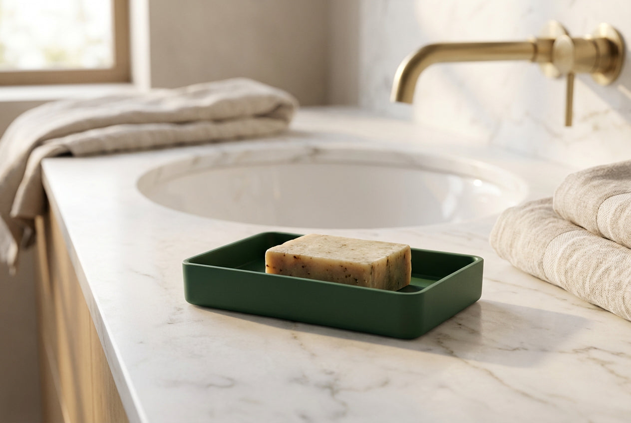 Diese Seifenschale bringt ruhiges Design und Ordnung an den Waschtisch. Die fein satinierte Oberfläche fühlt sich angenehm an und ist unempfindlich im Alltag. Acryl begeistert durch geringes Gewicht, hohe Formstabilität und einfache Pflege. Dank der geraden Kanten liegt die Seife sicher. Die geringe Höhe lässt Wasser leicht ablaufen, das reduziert Rückstände und hält die Seife länger trocken. Erhältlich in Weiß, Schwarz und Dunkelgrün. Ideal für moderne Bäder, Gäste WC und Küche.