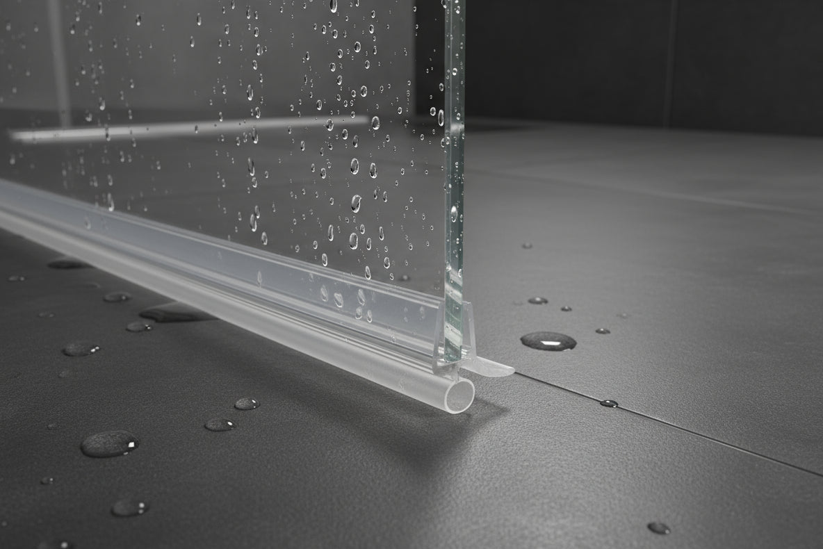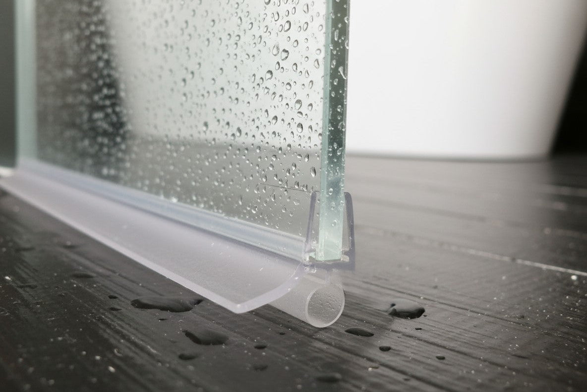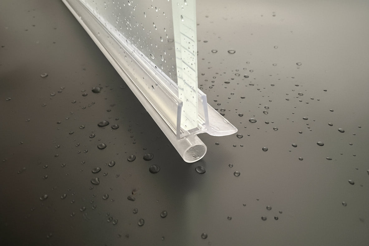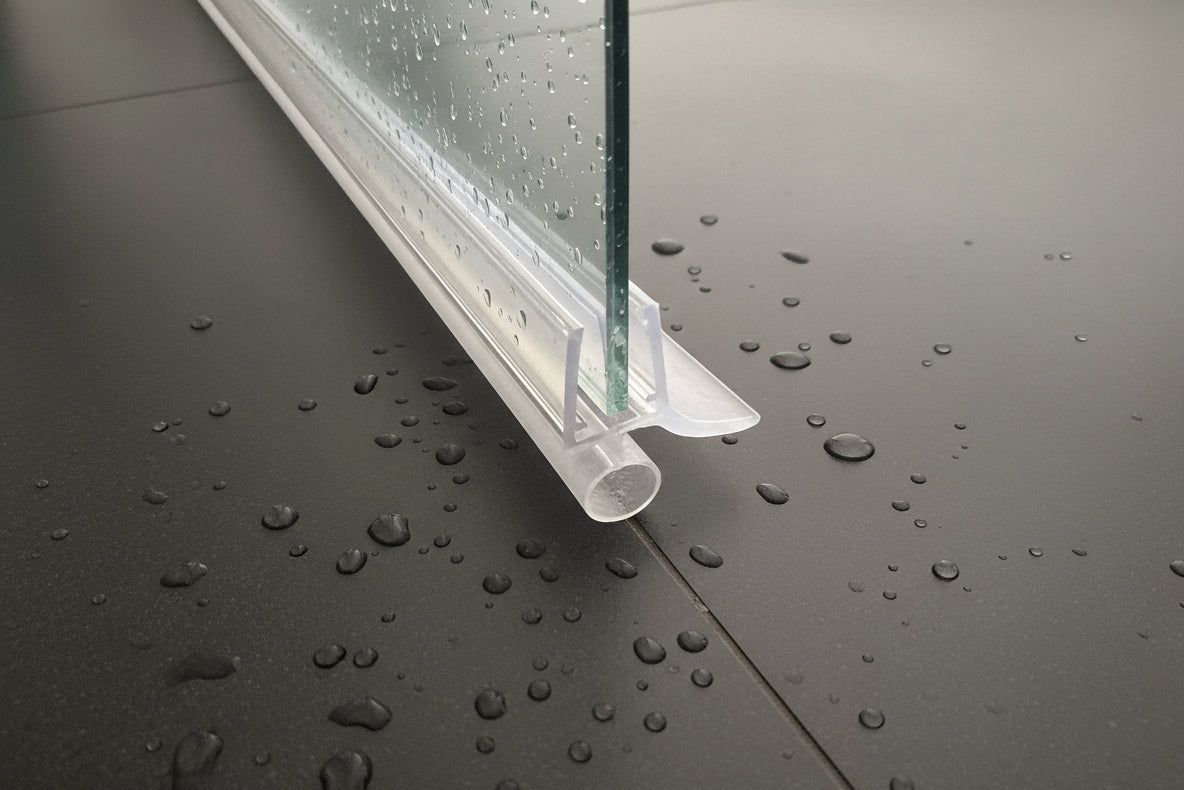 Die Dichtung hat eine Dichtröhre und eine Abtropfleiste. Die Dichtröhre dichtet senkrecht nach unten zum Boden ab. Die schräg stehende Dichtlippe an der Innenecke schützt den gefährdeten Bereich und lässt das Wasser als Abtropfkante in die Dusche abfließen.
